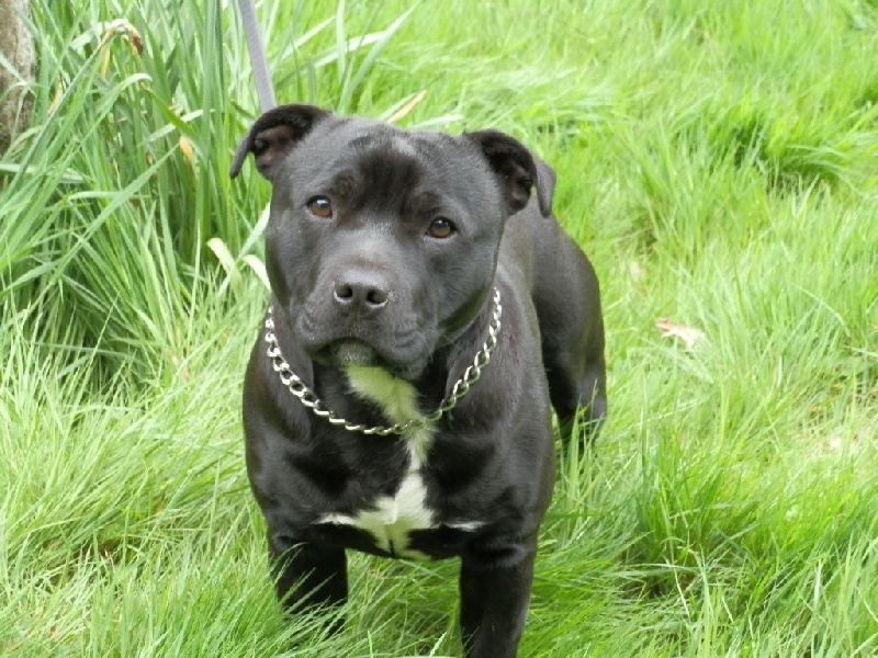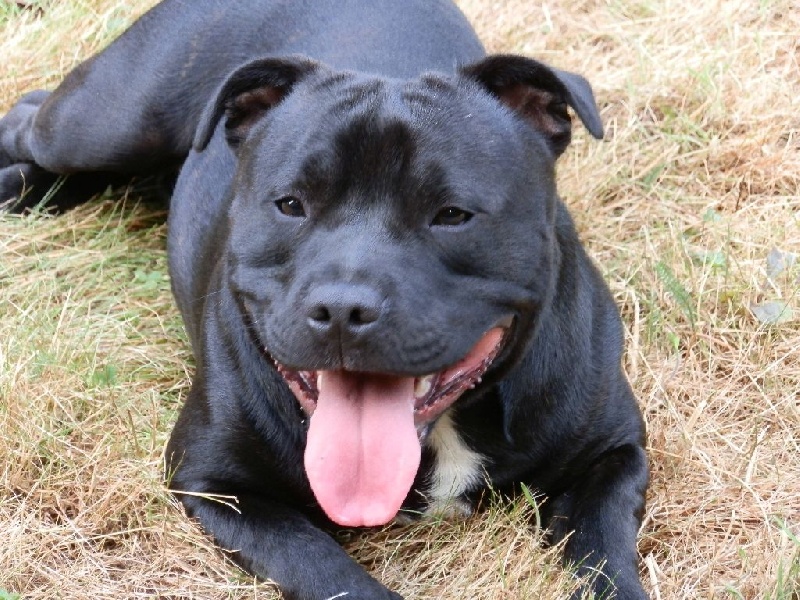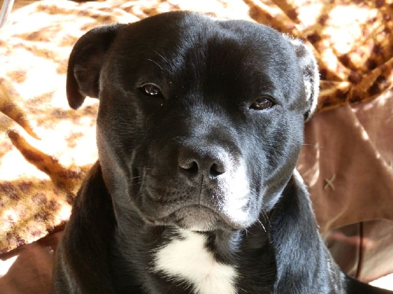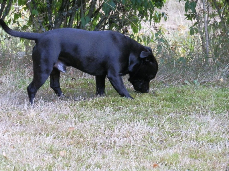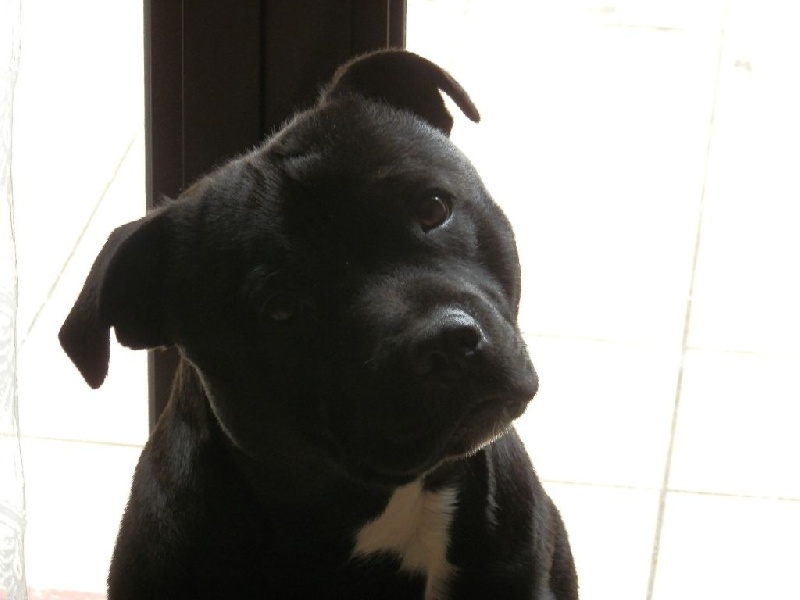 Il ne devait pas rester a l'élevage (je devrai dire a la maison puisque mes Staffies ont une vraie "vie de famille") mais sa mère ayant fait une mamite qq jours après sa naissance je l' ai élevé au biberon (ainsi que son frère) & je n'ai pas eu le coeur de m'en séparer.